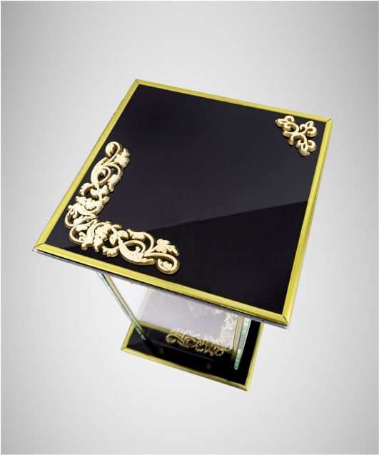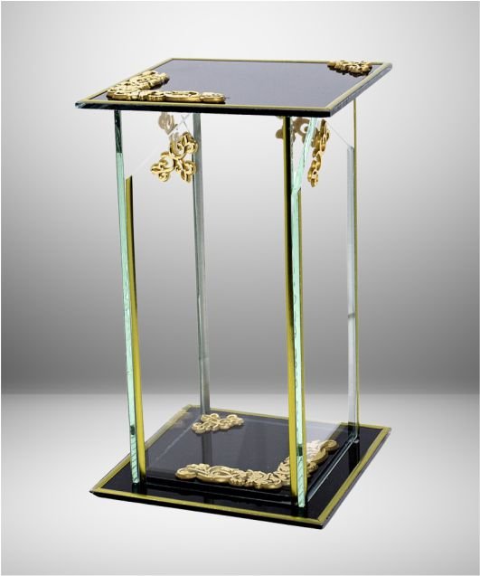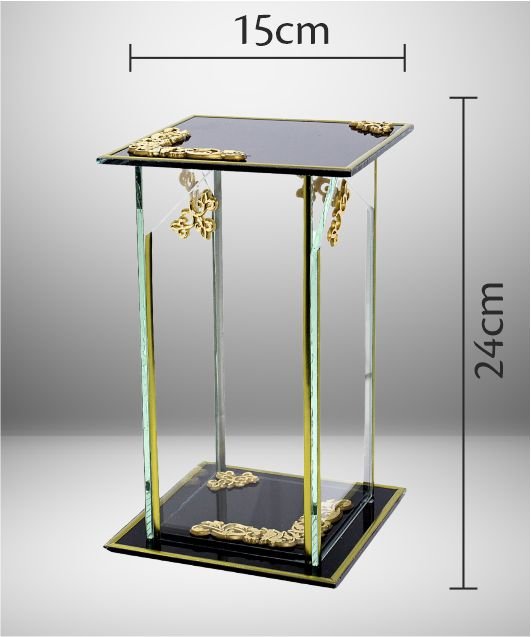 Sieniņas ir caurspīdīgas, savukārt augšdaļa un pamatne izgatavotas no melna stikla.