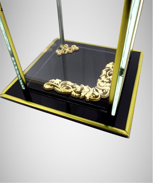 Laterna ir pilnībā izgatavota no stikla un dekorēta ar zelta krāsas detaļām.