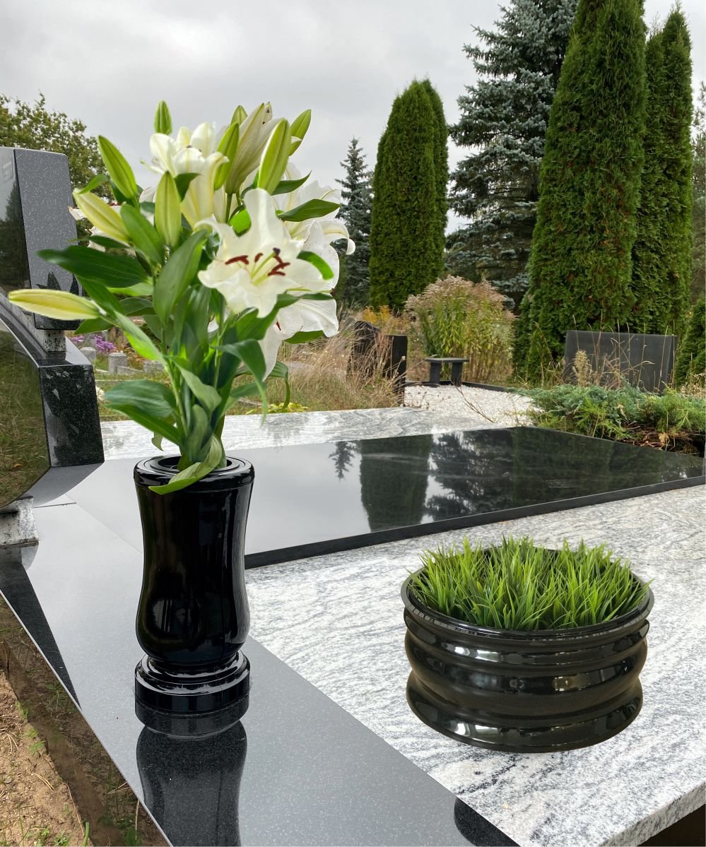 Puķu vāzei ir melna, glazēta krāsa, ar izņemamu plastmasas ieliktni. Puķu vāze labi piederēsies pie dažādu krāsu granīta plāksnēm.