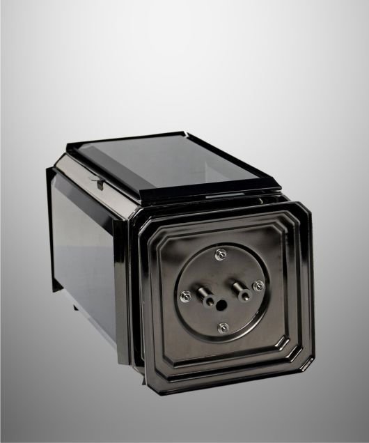 Laternai korpuss izgatavots no metāla ar tumši hromētu pārklājumu, bet logos ievietots tonēts dabīgais stikls.